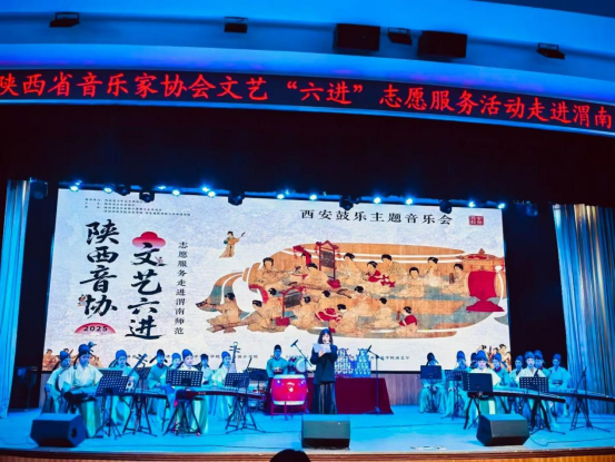 12 月 17 日,渭南师范学院陶然楼演艺厅内灯火璀璨、雅韵飞扬。陕西省音乐家协会“文艺六进”志愿服务活动走进渭南师范学院—西安鼓乐主题音乐会在此圆满举行。一场非遗之美的文化盛宴,让现场师生感受中华优秀传统文化的博大精深。本次活动由陕西省文学艺术界联合会指导,陕西省音乐家协会主办,陕西省音乐家协会笛箫专业委员会、渭南师范学院音乐学院、西安建筑科技大学华清学院联合承办,西安建筑科技大学华清学院艺术与设计学院鼓乐艺术团倾情献演。