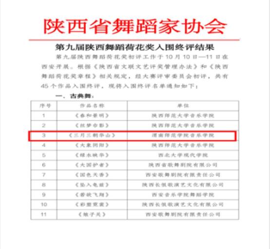 在本届评选中,我校舞蹈学专业教师苏力、贾楠、杨锴三位老师携手创作的原创舞蹈作品:古典舞《三月三.朝华山》成功入围终评。